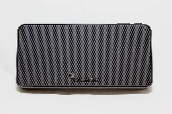 標準的藍牙喇叭設計,下面印著 Soundmatters LOGO、右上角為指示燈。