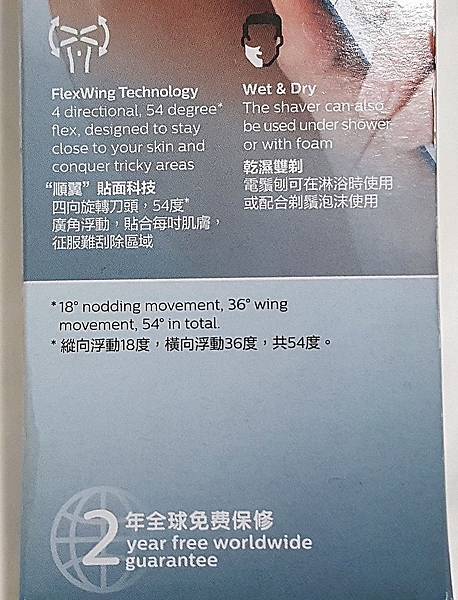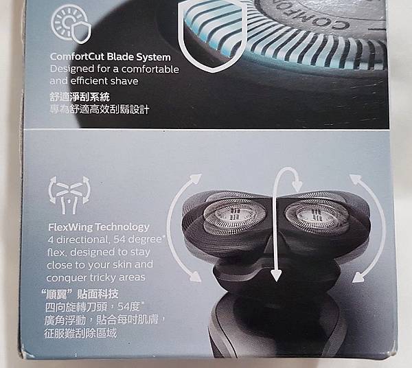 Philips U-tube S566 電動刮鬍刀的包裝右側:強調「順翼貼面科技」,採用4D立體彈性貼面刀頭、54度廣角浮動,貼合肌膚,征服死角部位,「乾濕雙剃」使得電鬍刀可在淋浴時使用或搭配刮鬍泡使用。