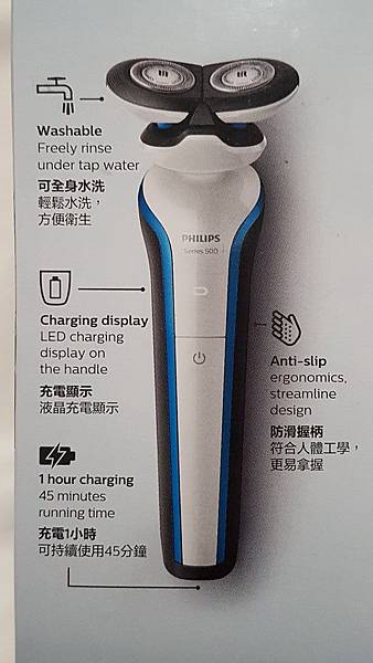 Philips U-tube S566 電動刮鬍刀的包裝左側:強調 S566 電動刮鬍刀具有 全機身可水洗、LED充電和電量顯示、充電1小時可用45分鐘、防滑握柄 特色。