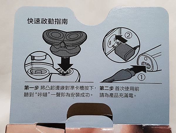 Philips U-tube S566 電動刮鬍刀的包裝剛打開時,有著最簡單明瞭的 快速啟動指南,只要把刀頭及刮鬍刀握把組合起來,首次使用前記得先充滿電,就可以立即上手使用。
