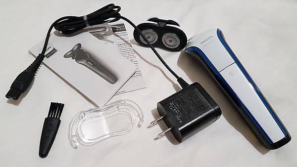 盒裝裡面的所有東西:刀頭組、主體握把、刀頭組透明保護蓋、刀頭清潔刷、充電用變壓器和兩本使用說明書。