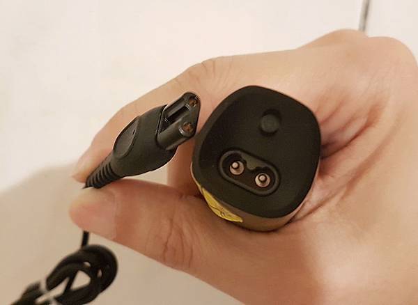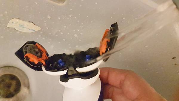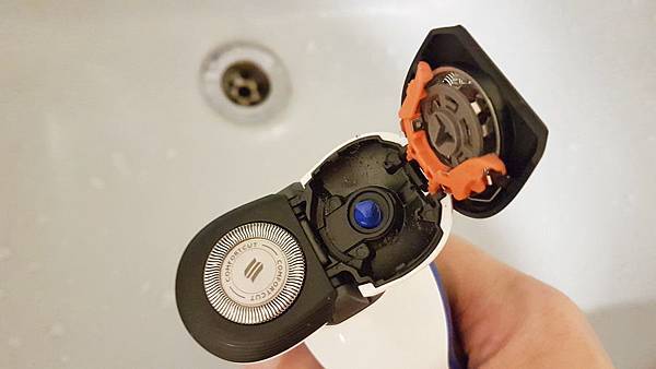 清洗非常簡單,先將刀頭朝下,用溫水沖洗,然後洗到一半在打開電源幾秒鐘,之後打開刀頭組去沖幾下就乾淨了,洗完再將水甩乾就好。