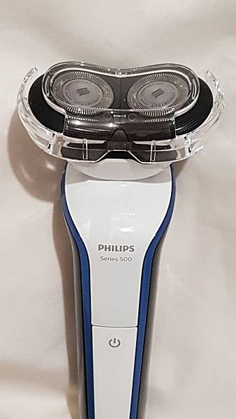 Philips U-tube S566 電動刮鬍刀 整體加上刀頭組透明保護蓋的正面照。