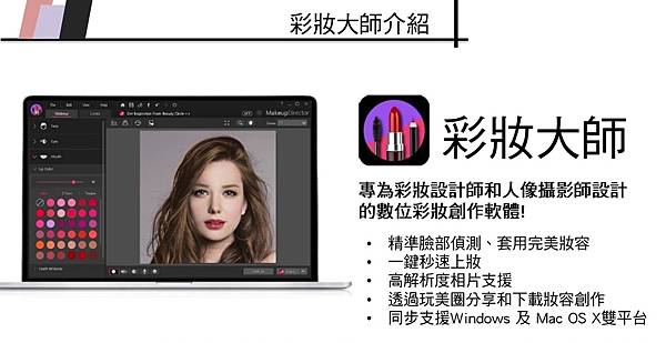 專門為了彩妝設計師及人像攝影師推出的「彩妝大師」數位彩妝創作軟體。