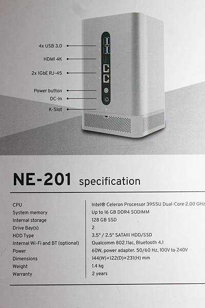 ▼ 精簡的包裝外盒,背面貼了一張 NE-201 產品規格表。