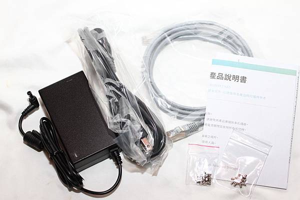 ▼ 配件盒:電源供應器×1、電源線×1、網路線×1、2.5吋硬碟螺絲×12、3.5吋硬碟螺絲×12、產品說明書。