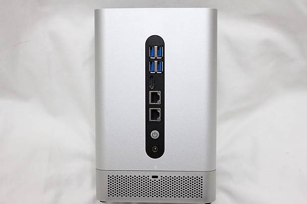 ▼ NE-201 孔位:四組 USB 接口皆為 3.0 高速規格、一組 HDMI 1.4a 支援4K解析度、2個 GbE RJ-45 網路孔、電源鍵、DC-IN