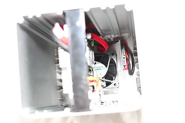 ▼ NE-201 內部:主機板非常小,只佔中間一小塊,底部可以看到僅有一顆散熱風扇。