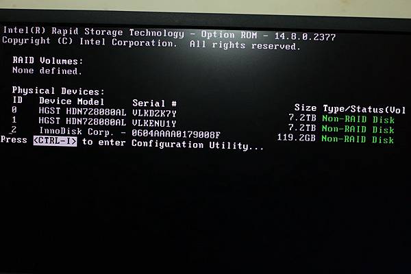 ▼ 開機的DOS畫面下,可以看到有一顆 128GB SSD(mSATA)、兩顆 HGST 8TB 硬碟。
