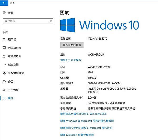 ▼ 照片為證 - NE-201 所預載的作業系統,真的是 Windows 10 企業版。(看起來就是爽…)