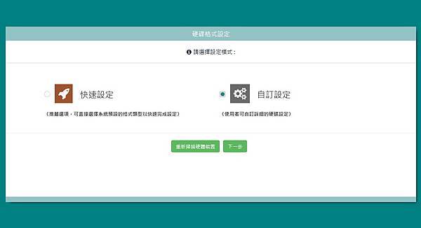 ▼ 硬碟格式設定有「快速」與「自訂」兩種。
