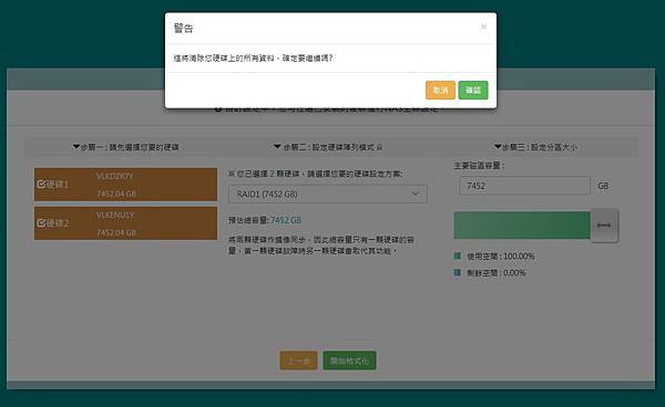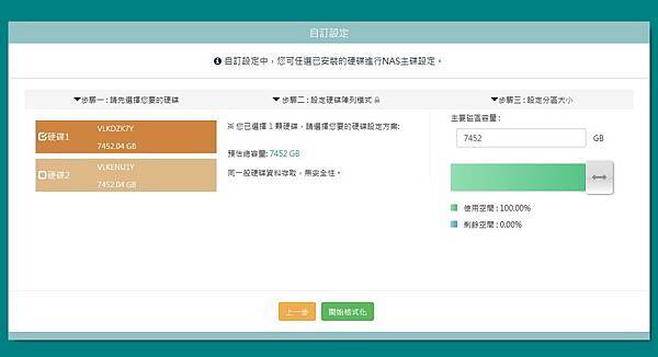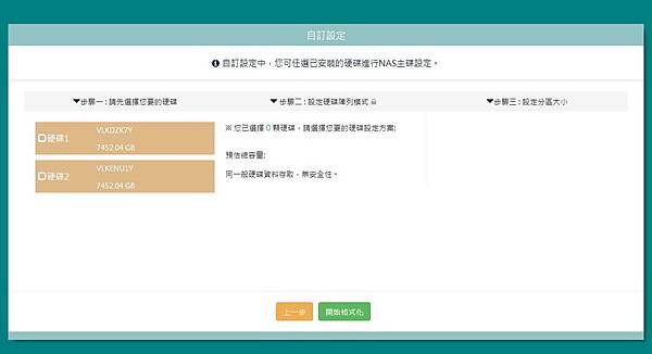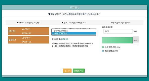 ‧選二顆硬碟:有RAID0及RAID1方案可選擇,並且顯示可使用容量及可設定分區大小。