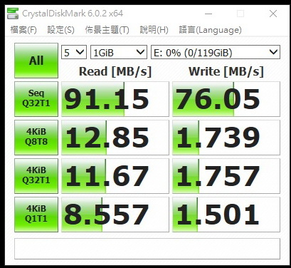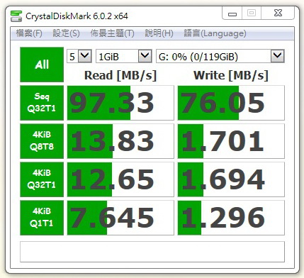 CrystalDiskMark測試 隨機模式:Seq讀取 97MB/s,Seq寫入 76MB/s。
