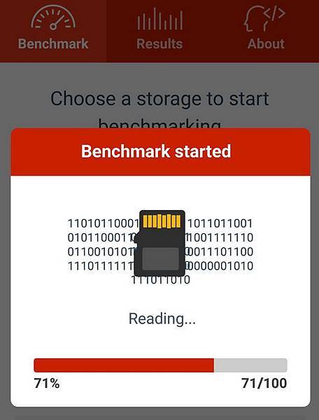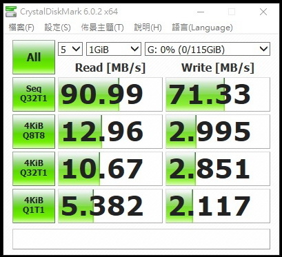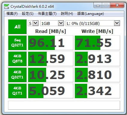 CrystalDiskMark測試 隨機模式:Seq讀取 96MB/s,Seq寫入 71MB/s。