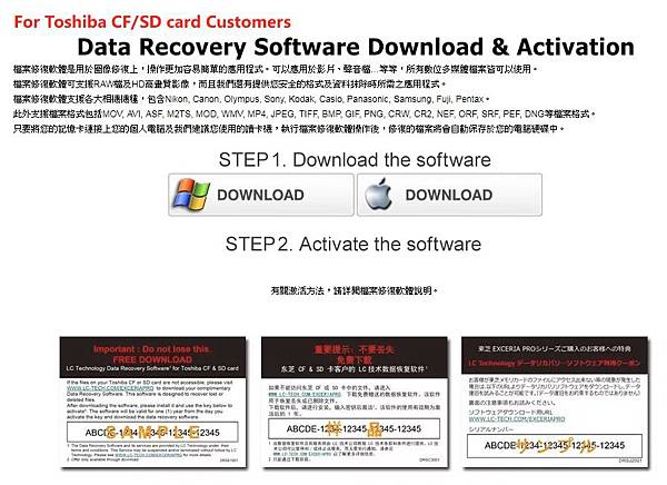 由下載網頁就可以看到此救援軟體支持各大相機機種(RAW檔),一般常用的 影片格式及照片格式,也都有列在其中;Toshiba 有幫消費者設想到這一方面真的很貼心,因為 不怕一萬、只怕萬一 真是再好形容不過了。