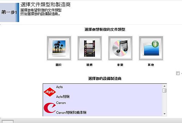 ▼ 依照救援的引導畫面可看到此軟體設計非常直覺,圖示選擇想要救援的檔案類型,甚至檔案是使用哪一牌的設備所拍攝的。