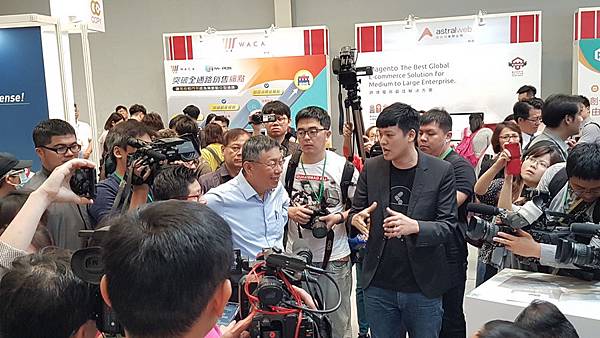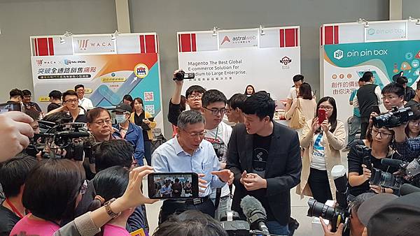 未來商務展 台北市長-柯文哲:現場的記者跟圍觀民眾 簡直是層層人海,筆者以最快的速度拿起手機,拍了數十張照片之後,趕快再馬上錄影。