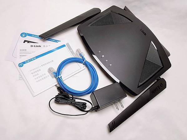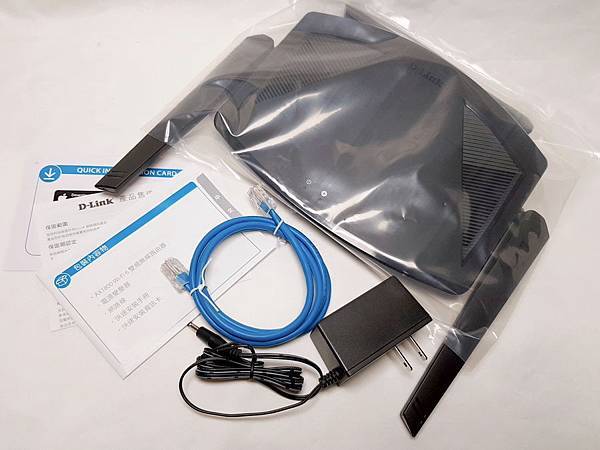 ▼ 盒裝完整內容物:DIR-X1860本體、說明書、網路線、變壓器。