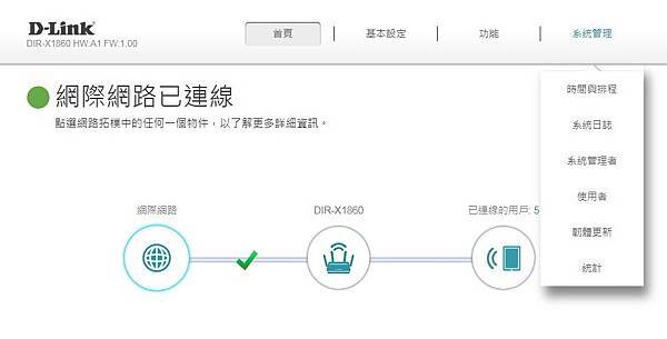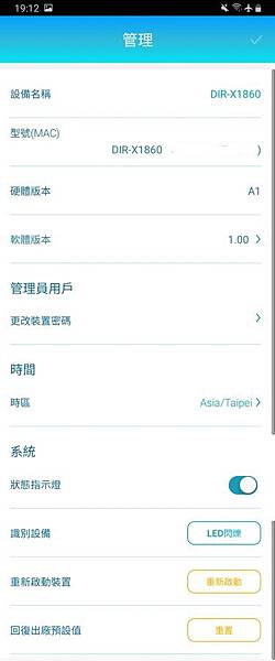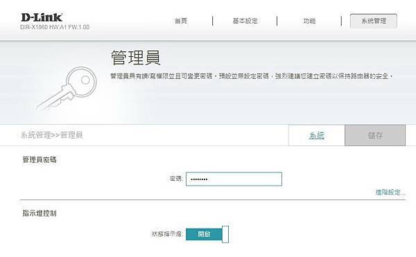 ▼ 管理:DIR-X1860 軟硬體版本、更改裝置密碼、開關指示燈(某些環境確實需要)、重新啟動、回復出廠預設值。