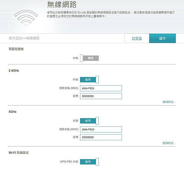 ▼ 筆者為了測試,還是把 智慧型連線 給關閉(一般是不需要),無線網路的 2.4G 跟 5G 分別設定。