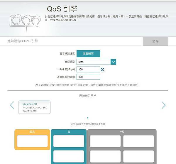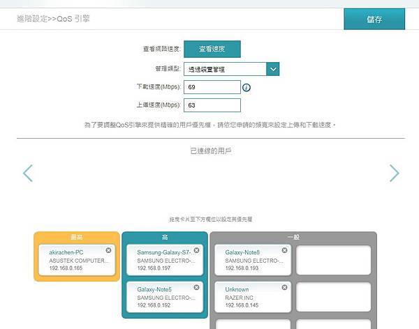 ▼ 筆者家中連接的裝置就有五台,QoS引擎 只要用拖拉的方式,就可以輕易的完成 優先權 設定。