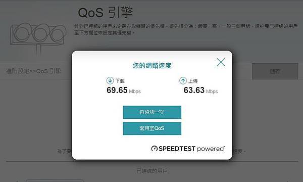 ▼ 筆者家中是申請 大大寬頻 66M/66M,測試出來的速度頗令人滿意,記得要 套用至QoS。