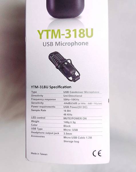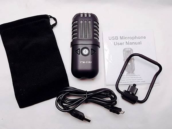 ▼ 主體與配件:YTM-318U麥克風、外出用束口袋、Micro-USB線長度1.2m、麥克風腳架、使用說明書。