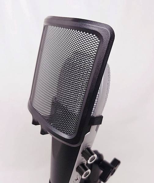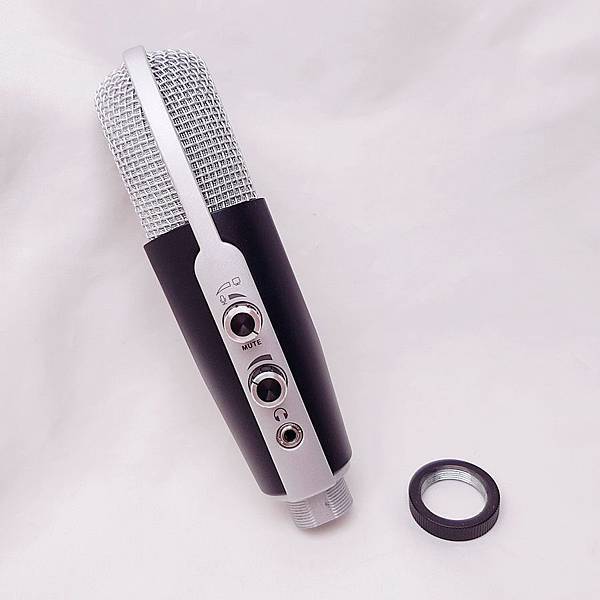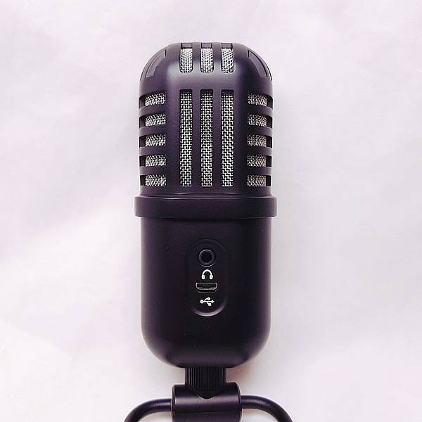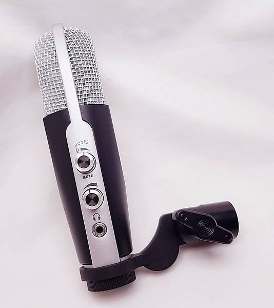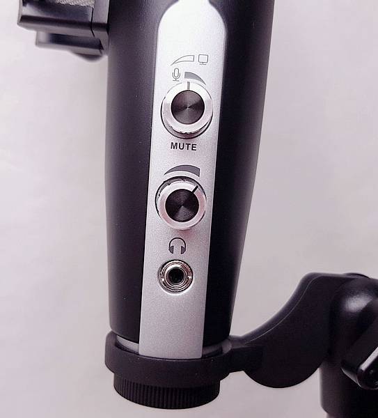 ▼ 麥克風 側面:上面旋鈕是調整麥克風音量,按押則是開關靜音、中間旋鈕是調整監聽音量、下面是監聽耳機的插孔。