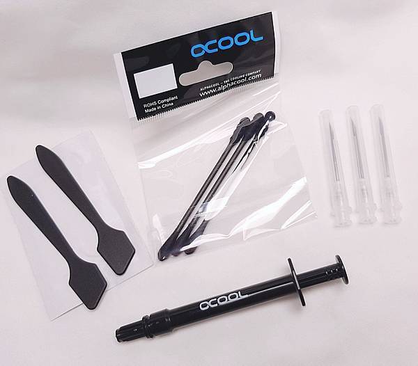 ▼ 內容物:ALPHACOOL液態金屬、散熱膏刮刀、酒精棉片、棉花棒*3、針頭*3。