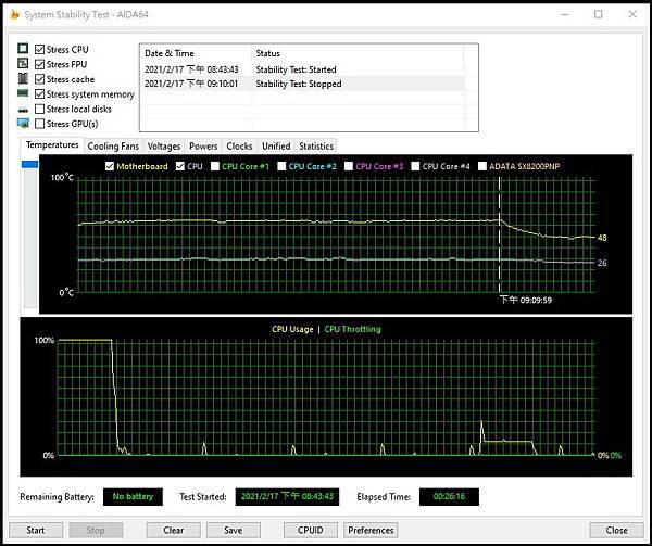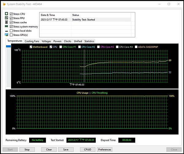 ▼ 使用 AIDA64 燒機26分鐘,可以看到 CPU溫度 大約是 32℃左右。
