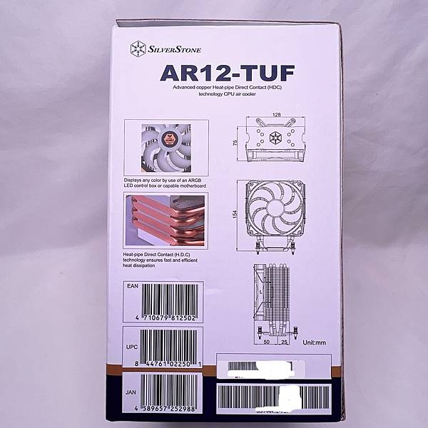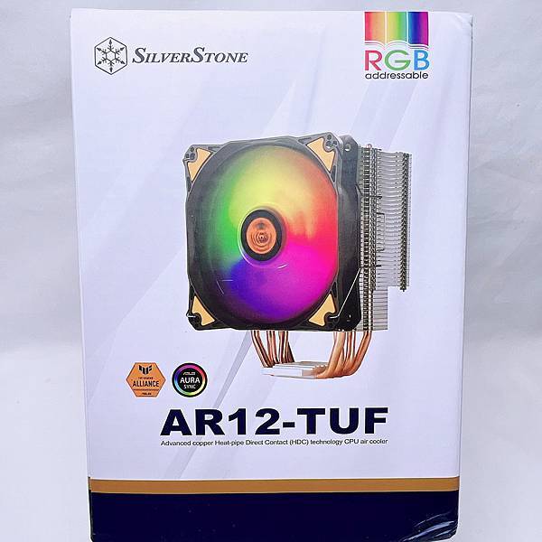 ▼ 由盒裝正面的LOGO才發現,原來這款散熱器是銀欣科技跟華碩合作的產品,有著4根6mm全銅熱導管直觸CPU,再搭配全鋁散熱鰭片來將CPU有效的散熱,風扇則是用 120mm ARGB PWM風扇,燈效則支援多家主機板燈控軟體。