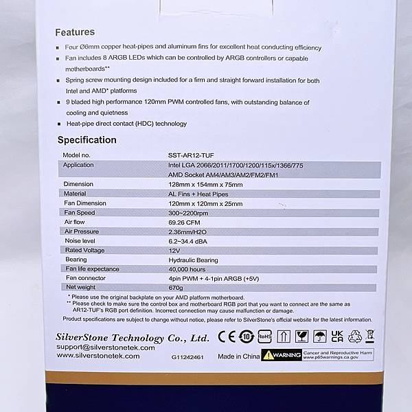 ▼ 盒裝背面則是 AR12-TUF 規格表,AR12-TUF 支援 Intel和AMD 所有市售主流平台,尤其是還支援 Intel 最新的 LGA 1700,散熱器的尺寸算是正常塔散大小,只要不是太小的機殼,安裝使用絕對沒問題。