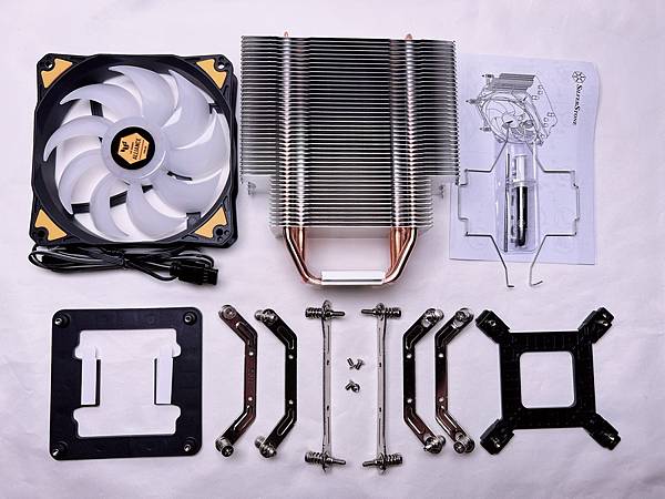 ▼ 盒內全部東西排列:ARGB風扇、塔散本體、風扇扣具、散熱膏、說明書、主機板及塔散固定扣具。