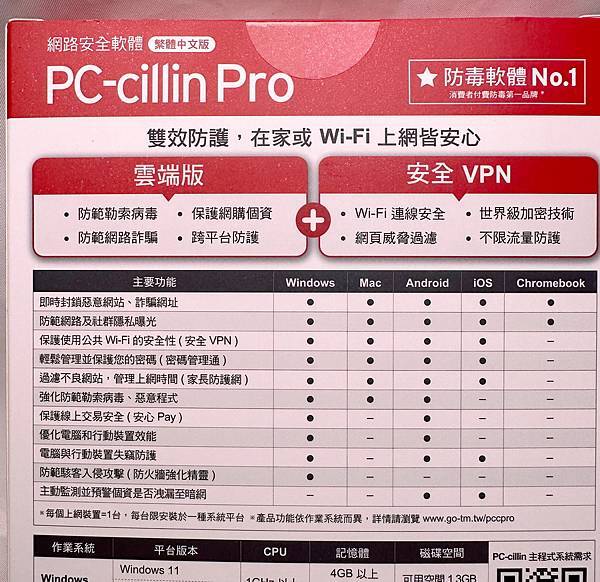 ▼ 盒裝背面 可以看到 PC-cillin Pro 特別圖示 雲端版 + 安全 VPN