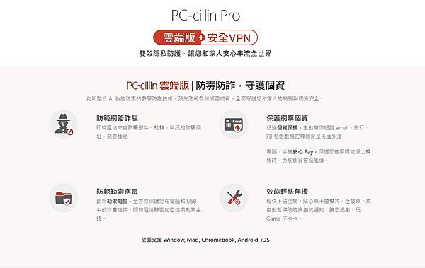 PC-cillin Pro 真可以說是 安內攘外 最佳典範,非常完美的結合 PC-cillin 2023雲端版 + 安全VPN。