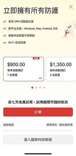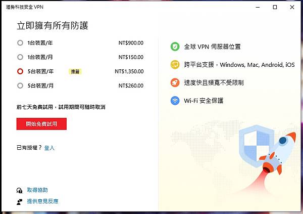 ▼ 趨勢科技安全 VPN 下載安裝後,看到可以免費試用七天,而且也看得到價位。(最划算的當然是 每年5台 1350元)