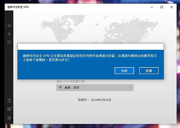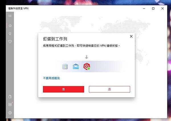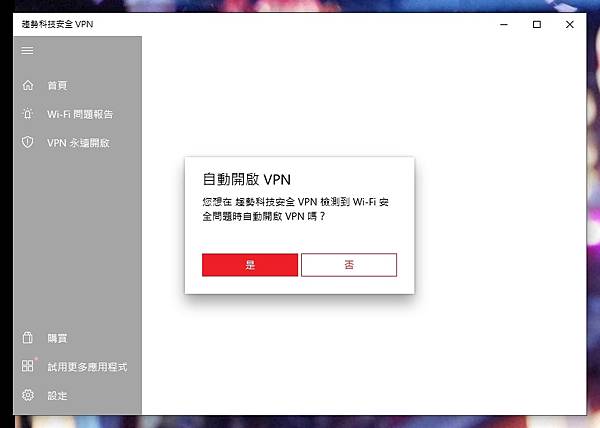 ▼ 安裝執行後,會直接先詢問是否 自動開啟 VPN、開啟 憑證,當然是要開啟最安全。