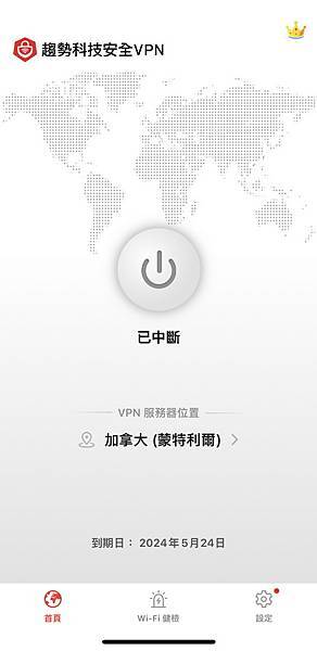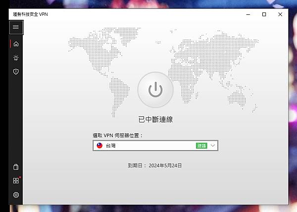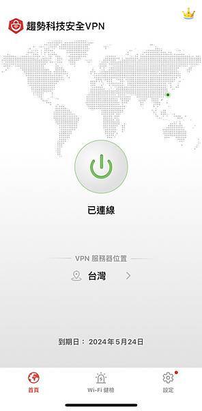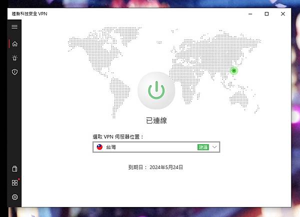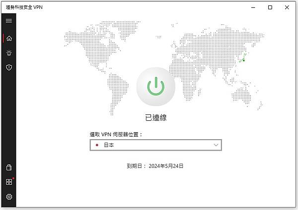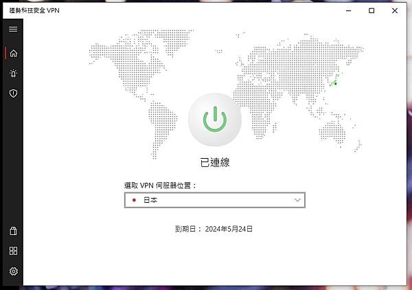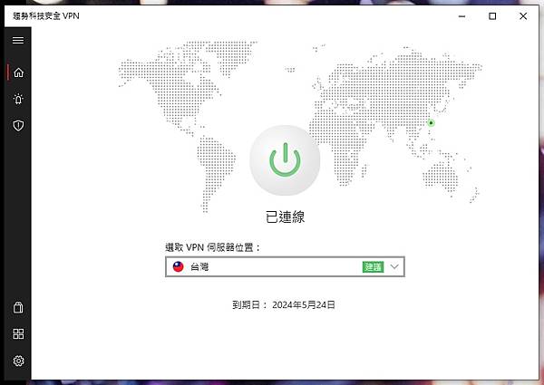 ▼ 使用介面很簡單又人性化,中間像電源開關的圖示,點下去呈現綠色,就代表 VPN 已經成功連結。