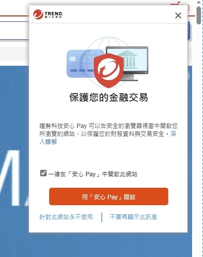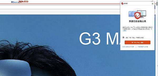 ▼ 網頁開啟 購物網站,會自動提醒用「安心 Pay」開啟網站。