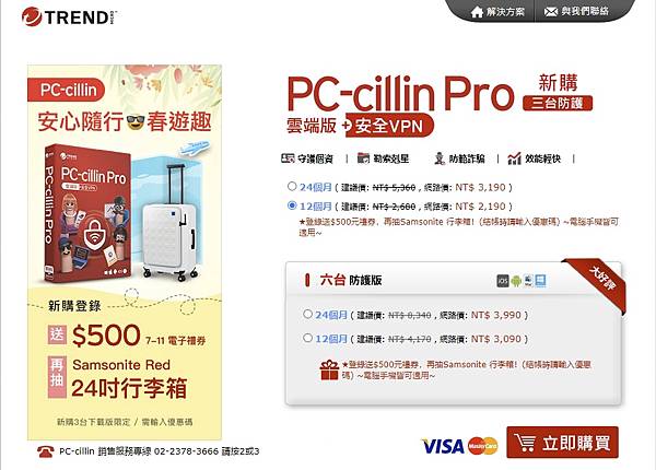 現在購買 PC-cillin Pro 登錄送 500元禮券,還可以抽 Samsonite Red 24吋行李箱。