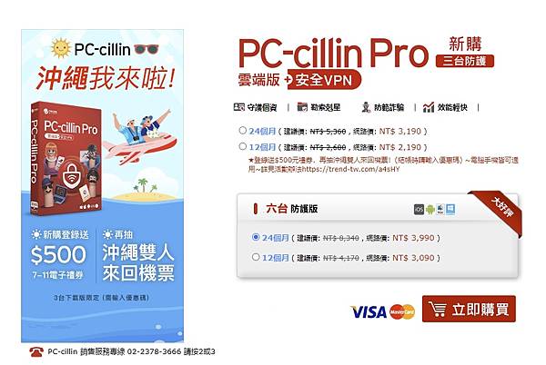 可以先下載體驗再購買喔!購買 PC-cillin Pro 新購登錄送 500元禮券,還可以抽 沖繩雙人來回機票。
