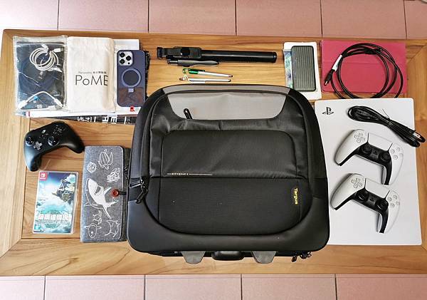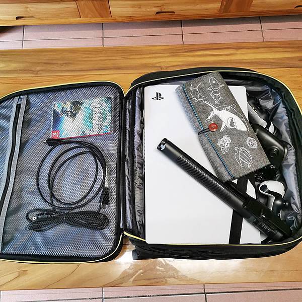 筆者使用此拉桿箱的最主要目的,是拿來放 PS5 帶去朋友家玩,因為 PS5 真的是巨大又笨重,加上還有兩支手把,不論是用背的、用提的真的是在練身體,有了這款拉桿箱,真的是方便又輕鬆。