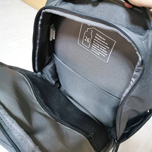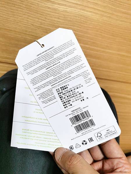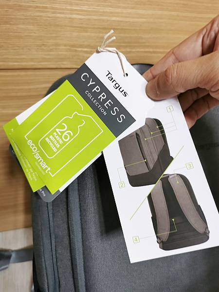 ▼ 吊牌標註此背包為 綠色環保系列背包,使用回收再生材料,為地球環保出一份力。