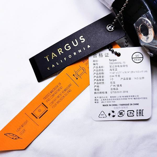 ▼ 背包上面的吊牌有詳細規格,Targus 系列包款都是 終身有限保固。