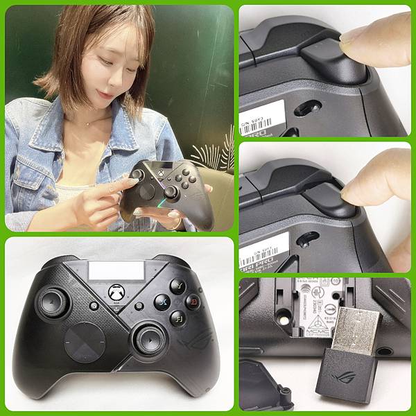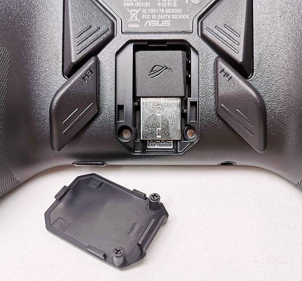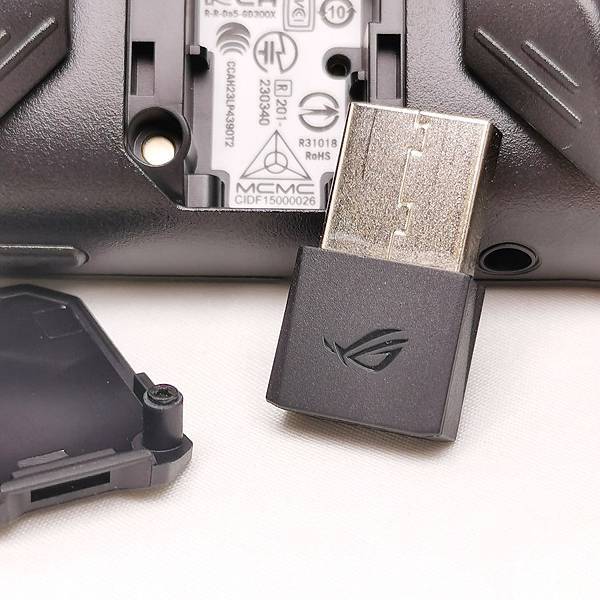 ▼ 隱藏式背蓋打開,裡面裝著 2.4 GHz 接收器,接收器上面同樣有 ROG LOGO。
