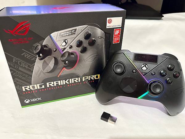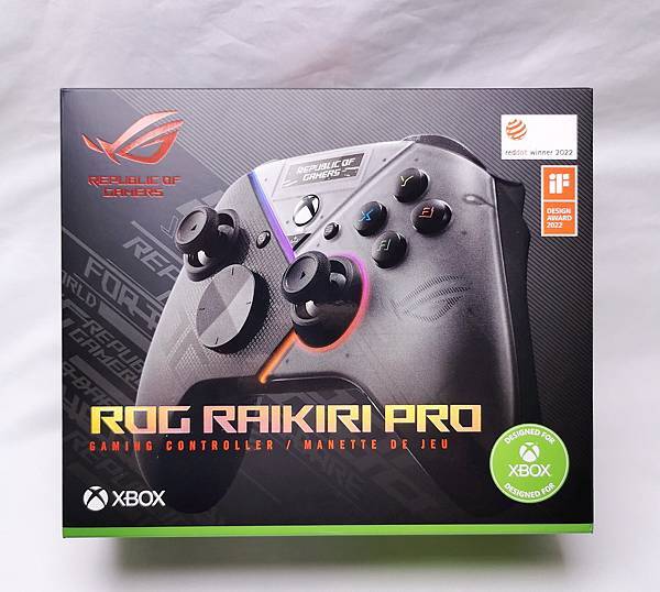 ▼ 外盒正面 除了左上方顯眼的 ROG LOGO,右上方更是標註獲得 2022年紅點、德國IF 兩大獎項,下方更是印著有 XBOX專用手把認證。
