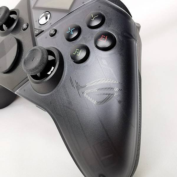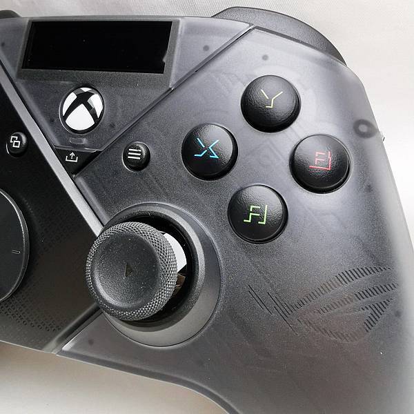 ▼ 右邊霧面半透明部份,可以看到一個大大的 ROG LOGO,近拍可以看到 類比搖桿蘑菇頭 邊緣有防滑處理,ABXY鍵 也使用邊緣標註,讓整體更有科技感。