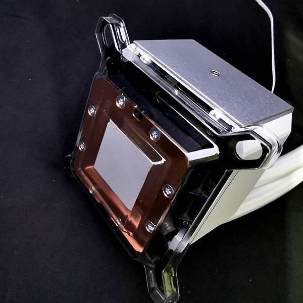 ▼ 水冷頭的底部為全銅底設計,很貼心的用塑膠硬殼包覆住避免碰撞,並且已經預先塗好了散熱膏。