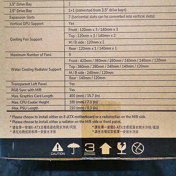 ▼ 外箱側面 除了有多國語言,另外標示產品基本規格,並有註明安裝 水冷排/風扇 注意事項。