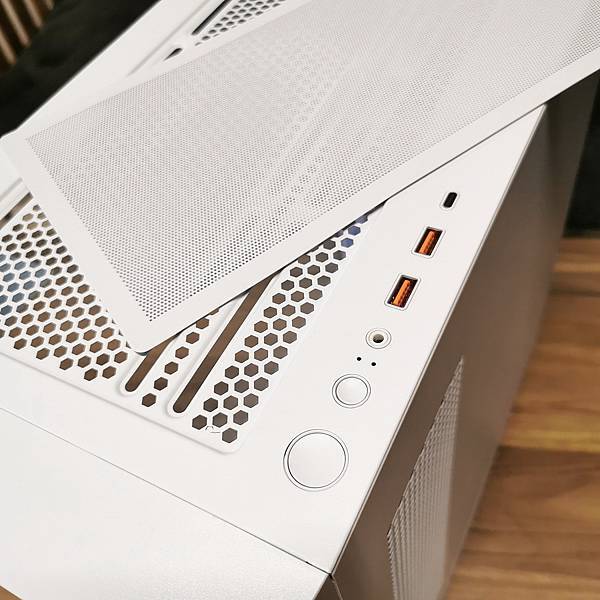 ▼ I/O 採上方設計 - 電源開關、RGB切換按鈕、HD音頻輸入/輸出插孔、兩組 USB3.2、USB3.2 Gen 2 Type-C。